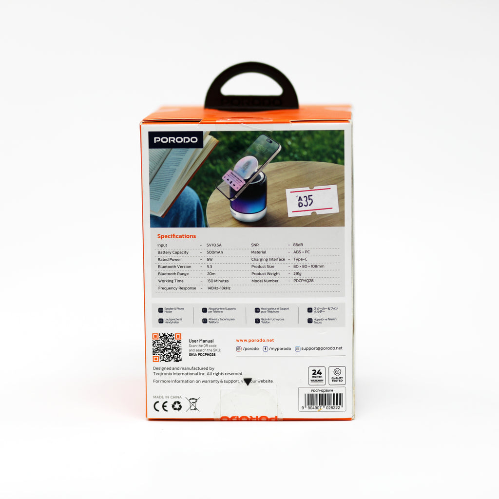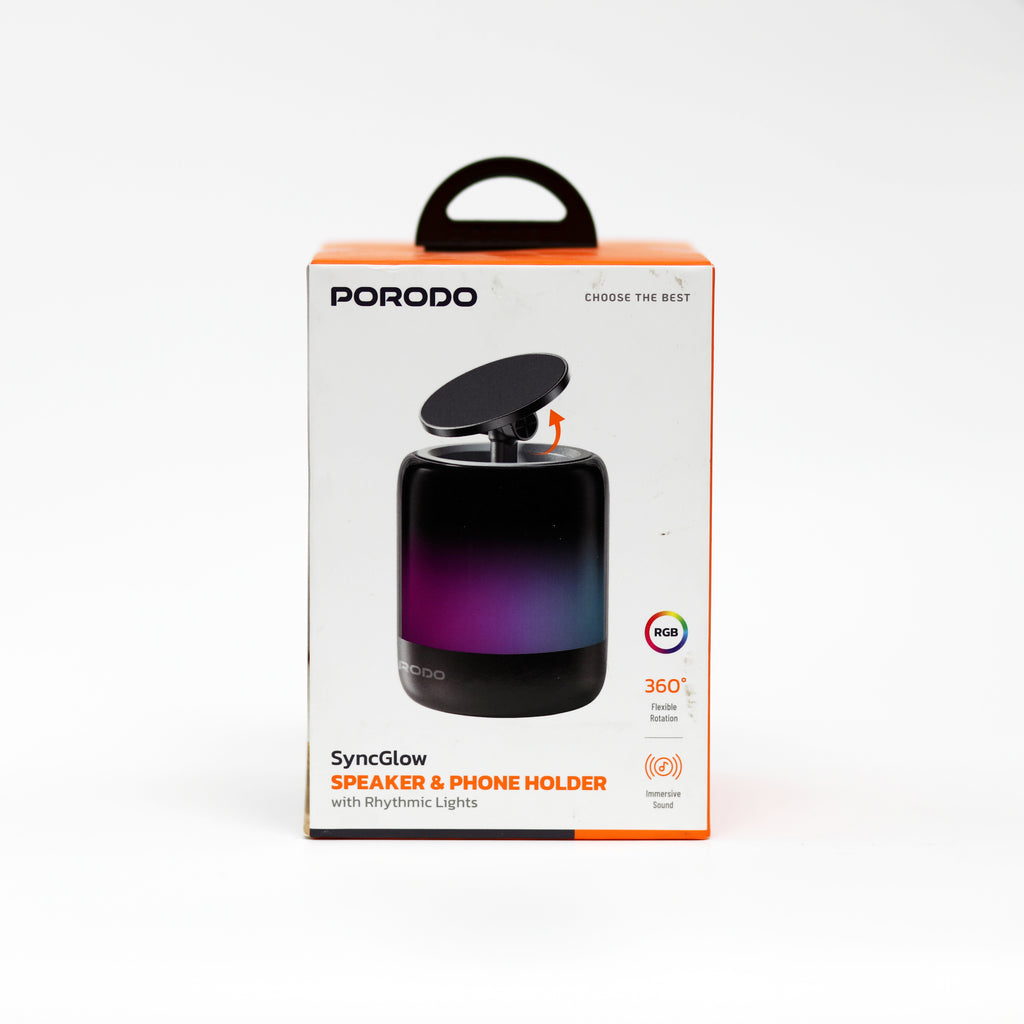 The Porodo SyncGlow Speaker & Phone Holder is a multifunctional device that combines powerful sound, stylish RGB lighting, and a convenient smartphone stand in one compact design.