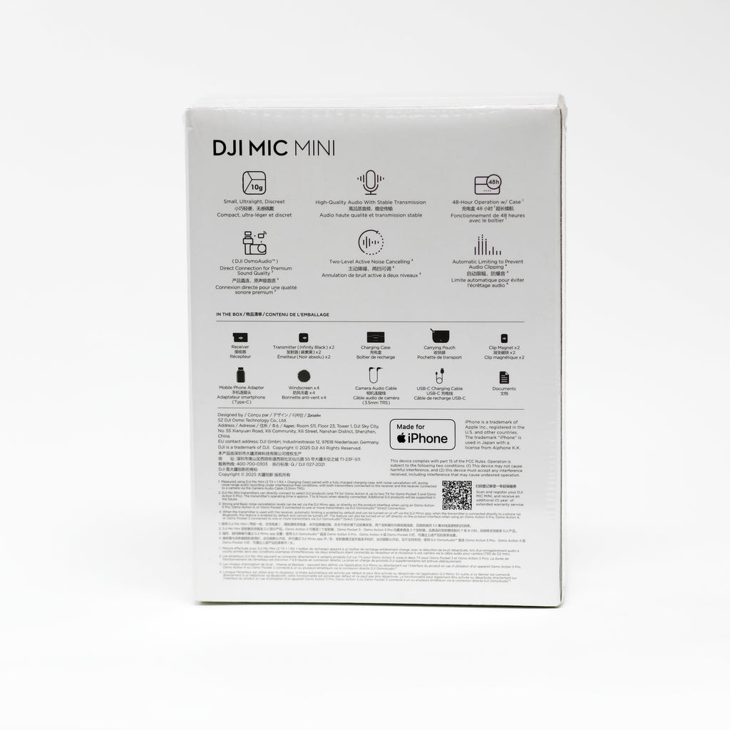 يوفر DJI Mic Mini أيضاً عمر بطارية طويل يصل إلى 48 ساعة عند استخدام علبة الشحن، مما يجعله مناسباً لجلسات التصوير الطويلة والإنتاج الاحترافي دون القلق من نفاد البطارية.