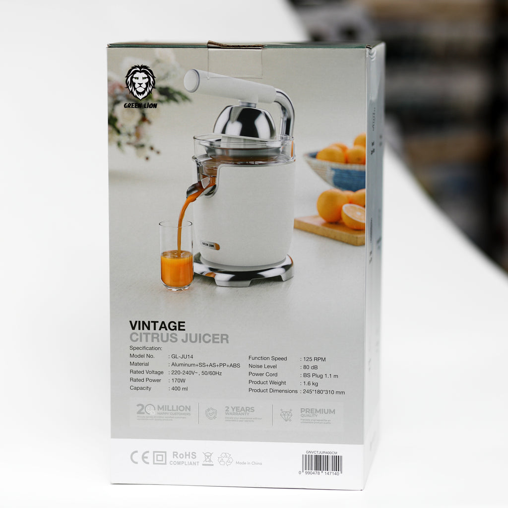 بفضل تصميمها الأنيق وأدائها القوي، تعد Green Lion Vintage Citrus Juicer خياراً مثالياً لتحضير عصير البرتقال الطازج أو عصير الليمون أو المشروبات الصحية اليومية بسهولة في المنزل.