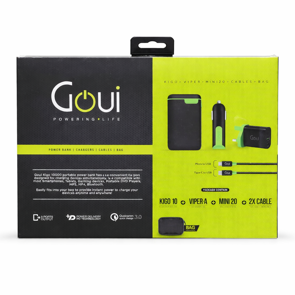 يعد طقم الشحن Goui Charging Kit حلاً متكاملاً لتوفير الطاقة لجميع أجهزتك أينما كنت. تم تصميم هذا الطقم العملي ليمنحك كل ما تحتاجه لشحن أجهزتك أثناء التنقل أو في المنزل أو في العمل.