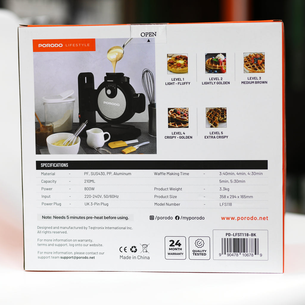 سواء كنت تحضر وافل الإفطار أو حلوى لذيذة أو وجبة خفيفة سريعة، فإن Porodo Vertical Waffle Maker يمنحك تجربة طهي سهلة ونتائج شهية في كل مرة.