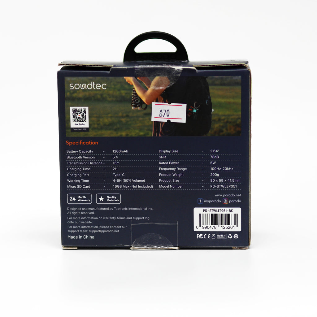 تُعد Soundtec Pocket Elite Speaker & Dialer من Porodo سماعة بلوتوث محمولة تجمع بين تشغيل الموسيقى وإجراء المكالمات في جهاز واحد صغير الحجم.